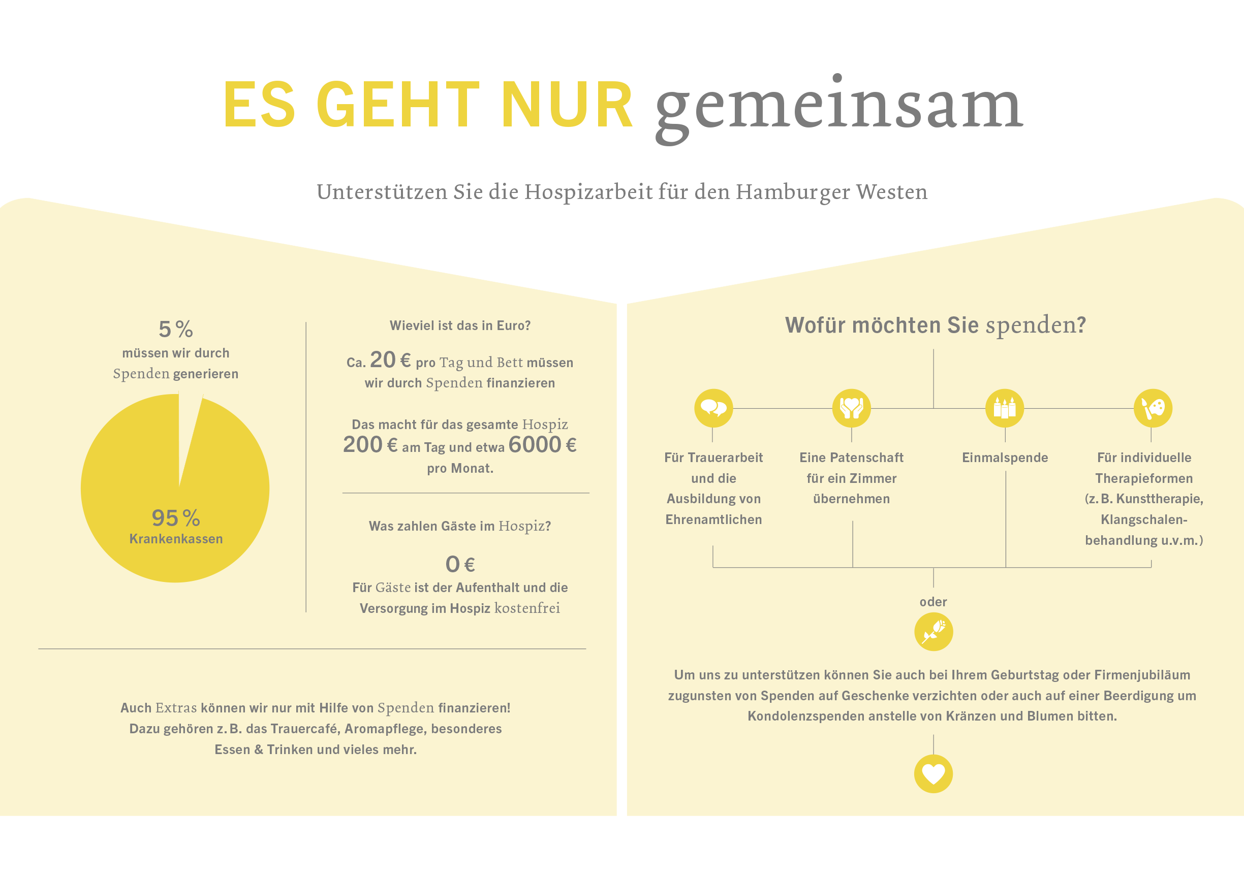 Die Gesamtkosten werden zu 95% von den Kranken- und Pflegekassen übernommen. Die verbleibenden 5% muss jedes Hospiz aufgrund der Gesetzeslage selbst aufbringen. Dafür sind wir auf Ihre finanzielle Unterstützung angewiesen.